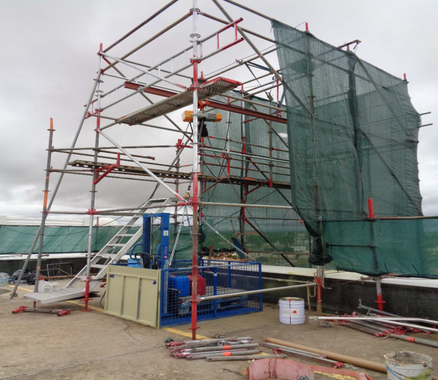 Tanto para a Fase A como para B foi montada uma torre de acesso, uma a poente e outra a nascente, para colocação do sistema de transporte de equipamentos, produtos, movimentação de lixos, etc…