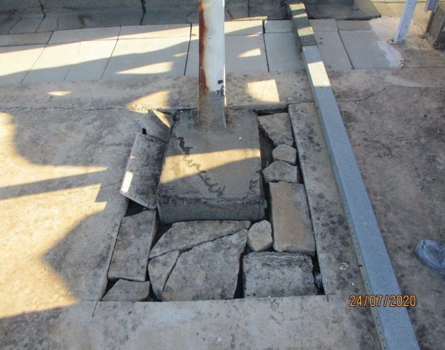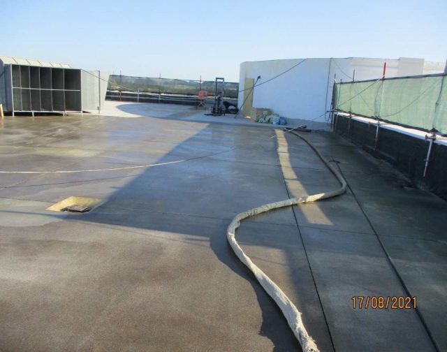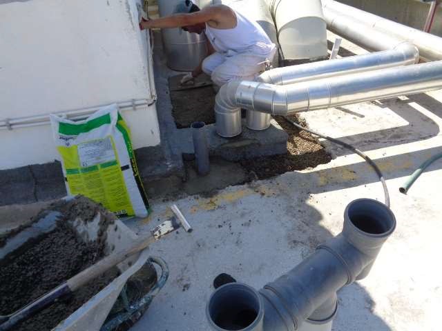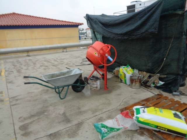 As zonas degradadas e/ou Alvo de diversas intervenções, nomeadamente montagem de novos equipamentos, alterações que interferiram com a cobertura e que não foram alvo de reposição, etc…, foram limpas, cheias com argamassa leve de cimento e LEKA, e regularizadas com argamassa de cimento e areia;