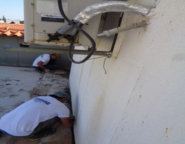 Nas zonas mais deterioradas, nomeadamente nas juntas e fendas foram aplicadas três (3) demãos para depois se poder colocar uma fita fusível antes da projecção do Elastómero.
