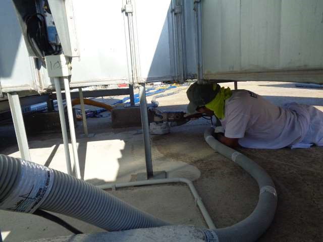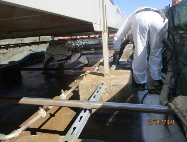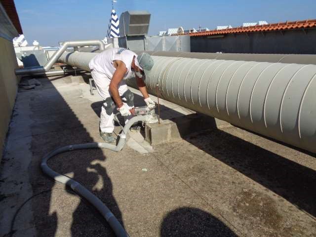 Também em alguns equipamentos e tubagem de acesso impossível, foram colmatados com adaptações em Floormate e posteriormente revestidas com o Elastómero/Poliureia.