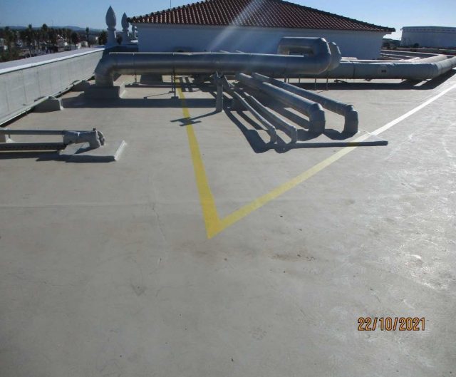 A superfície previamente reparada e preparada foi projectada com Elastómero de Projecção a Quente QUESTOL 106W com uma espessura média de 2mm.